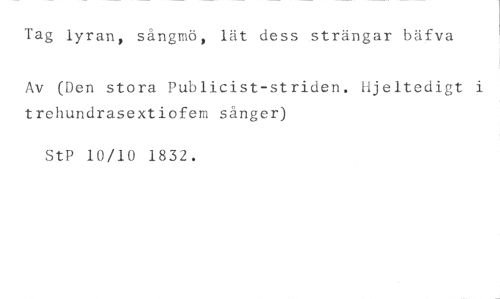 Tag lyran, sångmö, lät dess strängar bäfva //// Av (Den stora Publicist-striden. lijeltedigt i trehundrasextiofem sånger) //// StP 10/10 1832.