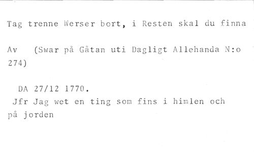 Tag trenne Werser bort, i Resten skal du finna //// Av (Swar på Gåtan uti Dagligt Allehanda N:o //// 274) //// DA 27/12 1770. //// Jfr Jag wet en ting som fins i himlen och på jorden