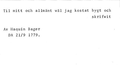 Til mitt och allmänt wäl jag kostat bygt och //// skrifwit //// Av Haquin Bager DA 21/9 1779.