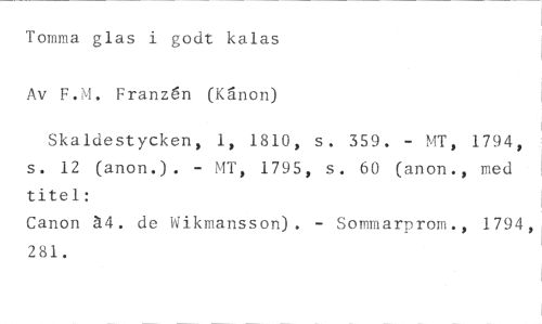 Tomma glas i gods kalas //// Av F.M. Franzén (Kanon) //// Skaldestycken, 1, 1810, s. 359. - MT, 1794, s. 12 (anon.). - MT, 1795, s. 60 (anon., med titel: //// Canon å4. de Wikmansson). - Sommarprom., 1794, 281.