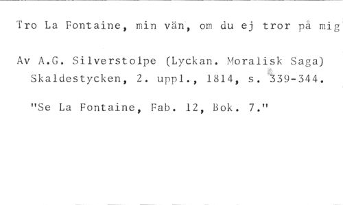 Tro La Fontaine, min vän, on du ej tror på mig //// Av A.G. Silverstolpe (Lyckan. Moralisk Saga) Skaldestycken, 2. uppl., 1814, s. 339-344. //// "Se La Fontaine, Fab. 12, Bok. 7."