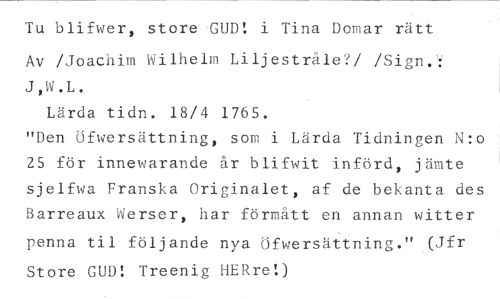 Tu blifwer, store GUD! i Tina Domar rätt //// Av /Joachim Wilhelm Liljestråle? //// /J,W.L. //// Lärda tidn. 18/4 1765. //// "Den öfwersättning, som i Lärda Tidningen N:o 25 för innewarande år blifwit införd, jämte sjelfwa Franska Originalet, af de bekanta des Barreaux Werser, har förmått en annan witter //// penna til följande nya öfwersättning." (Jfr Store GUD! Treenig HERret)