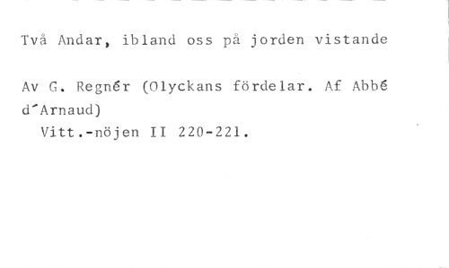Två Andar, ibland oss på jorden vistande //// Av G. Regn6r (Olyckans fördelar. Af Abb6 d'Arnaud) //// Vitt.-nöjen II 220-221.