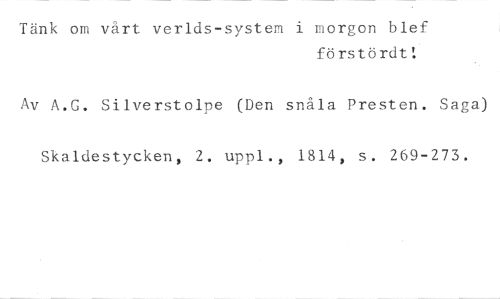 Tänk om vårt verlds-systen i morgon blef //// förstördt! //// Av A.G. Silverstolne (Den snåla uresten. Saga) //// Skaldestycken, 2. uppl., 1814, s. 269-273.