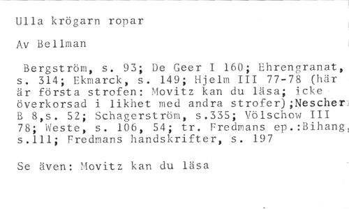 Ulla krögarn ropar Av Bellman //// Bergström, s. 93; De Geer I 160; Ehrengranat, s. 314; Ekmarck, s. 149; Hjelm III 77-78 (här är första strofen: Movitz kan du läsa; icke överkorsad i likhet med andra strofer);NescherJ B 8,s. 52; Schagerström, s.335; Völschow III 78; Weste, s. 106, 54; tr. Fredmans ep.:Bihang, s.111; Fredmans handskrifter, s. 197 //// Se även: Movitz kan du läsa