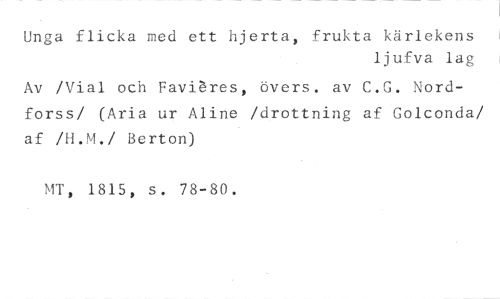 Unga flicka med ett hjerta, frukta kärlekens //// ljufva lag //// Av /\rial och Favi'e'res, övers. av C.G. Nordforss/ (Aria ur Aline /drottning af Golconda/ af /H.M./ Berton) //// MT, 1815, s. 78-80.