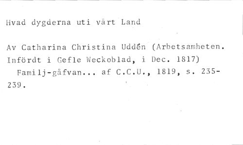 livad dygderna uti värt Land //// Av Catharina Christina Uddlin (Arbetsamheten. Infördt i Gefle Weckoblad, i Dec. 1817) Familj-gåfvan... af C.C.U., 1819, s. 235239.