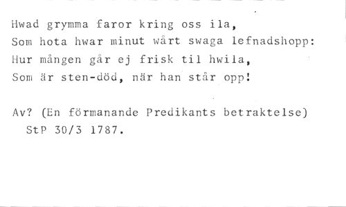 Hwad grymma faror kring oss ila, //// Som hota hwar minut vårt swaga lefnadshopp: Hur mången går ej frisk til hwila, Som är sten-död, när han står opp! //// Av? (En förmanande Predikants betraktelse) StP 30/3 1787.