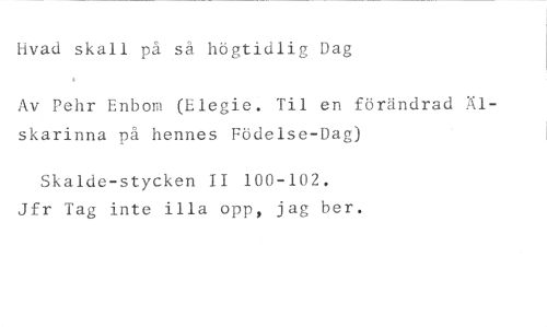 Hvad skall på så högtidlig Dag //// Av Pehr Enbom (Elegie. Til en förändrad Älskarinna på hennes Födelse-Dag) //// Skalde-stycken II 100-102. Jfr Tag inte illa opp, jag ber.