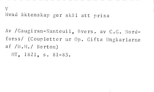 V //// Fivad äktenskap ger skäl att prisa //// Av /Gaugiran-Nanteuil, övers. av C.G. Nordforss/ (Coupletter ur Op. Gifta Ungkarlarne af /H.M./ Berton) //// MT, 1821, s. 81-83.