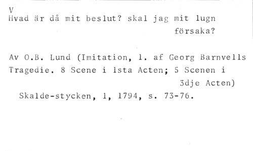 V //// Hvad är då mit beslut? skal jag mit lugn //// försaka? //// Av O.B. Lund (Imitation, 1. af Georg Barnvells Tragedie. 8 Scene i ista Acten; 5 Scenen i //// 3dje Acten) //// Skalde-stycken, 1, 1794, s. 73-76.