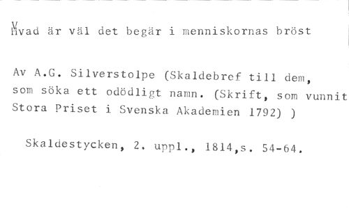 Evad är väl det begär i menniskornas bröst //// Av A.G. Silverstolpe (Skaldebref till dem, som söka ett odödligt namn. (Skrift, som vunnit Stora Priset i Svenska Akademien 1792) ) //// Skaldestycken, 2. -11771., 1814,s, 54-64.