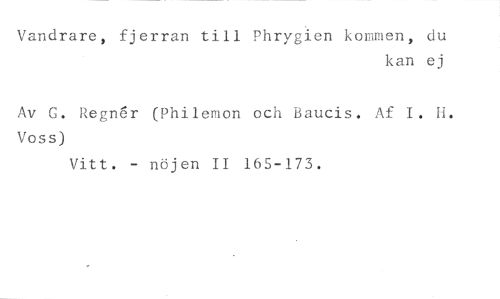Vandrare, fjerran till Phrygien kommen, du //// kan ej //// Av G. Regnar (Philemon och Baucis. Af I. H. Voss) //// Vitt. - nöjen II 165-173.