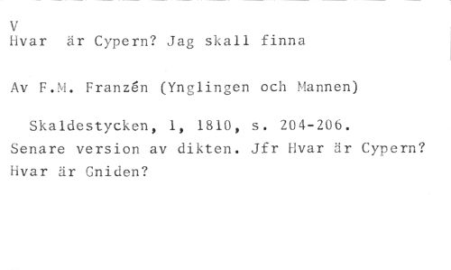V //// Hvar är Cypern? Jag skall finna //// Av F.M. Franzén (Ynglingen och Mannen) //// Skaldestycken, 1, 1810, s. 204-206. //// Senare version av dikten. Jfr Hvar är Cypern? Hvar är Gniden?