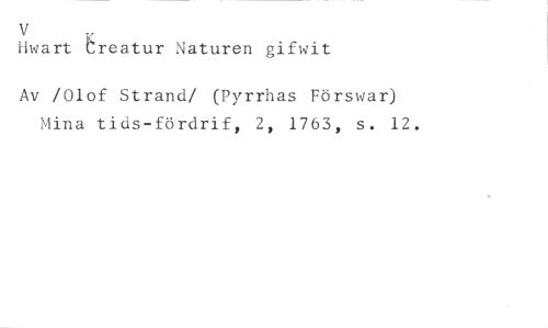 Hwart reatur Naturen gifwit //// Av /Olof Strand/ (Pyrrhas Förswar) Mina tids-fördrif, 2, 1763, s. 12.