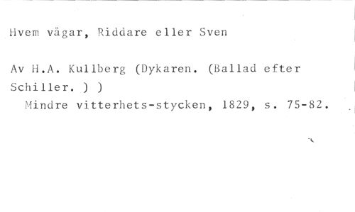 Hvem vågar, Riddare eller Sven //// Av H.A. Kullberg (Dykaren. (Ballad efter Schiller. ) ) //// Mindre vitterhets-stycken, 1829, s. 75-82.