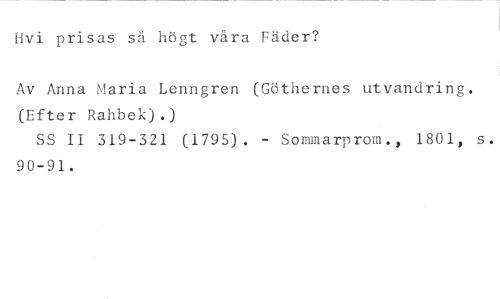 Hvi prisas så högt våra Fäder? //// Av Anna Maria Lenngren (Götherles utvandring. (Efter Rahbek).) //// SS II 319-321 (1795). - Sommarprom., 1801, s. 90-91.