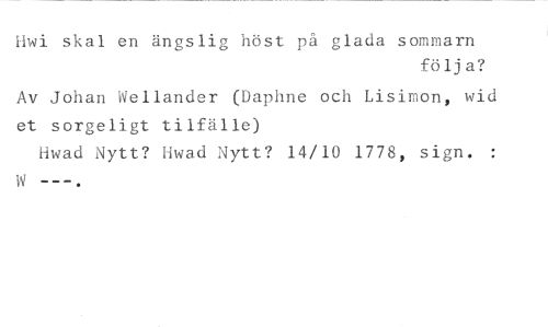 H i skal en ängslig höst på glada sommarn //// följa? //// Av Johan Wellander (Daphne och Lisimon, wid et sorgeligt tilfälle) //// Hwad Nytt? Hwad Nytt? 14/10 1778, sign. : //// W