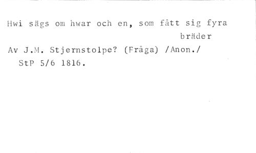 Hwi sägs om hwar och en, som fått sig fyra //// bräder //// Av J.M. Stjernstolpe? (Fråga) /Anon. //// /StP 5/6 1816.