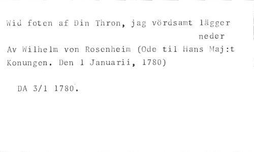 Wid foten af Din Thron, jag vördsamt lägger //// neder //// Av Wilhelm von Rosenheim (Ode til Hans Maj:t Konungen. Den 1 Januarii, 1780) //// DA 3/1 1780.