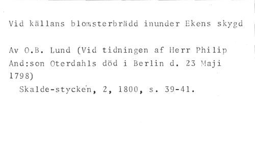 Vid källans blomsterbrädd inunder Ekens skygd //// Av O.B. Lund (Vid tidningen af Herr Philip And:son Oterdahls död i Berlin d. 23 Maji 1798) //// Skalde-styck6n, 2, 1800, s. 39-41.