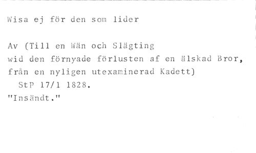 Wisa ej för den som lider //// Av (Till en Wän och Slägting //// wid den förnyade förlusten af en älskad Bror, //// från en nyligen utexaminerad Kadett) //// StP 17/1 1828. //// "Insändt."