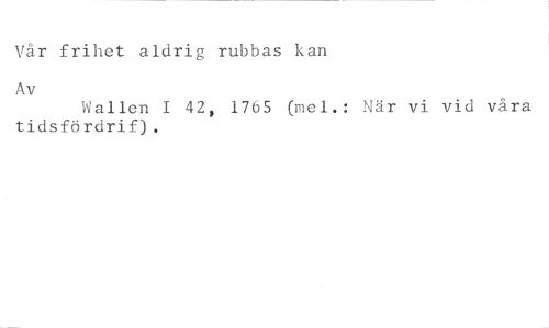 Vår frihet aldrig rubbas kan //// Av //// Wallen 1 42, 1765 (mel.: När vi vid våra tidsfördrif).