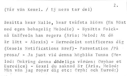 2. //// (Vår vän Kexel. / Ej mera tar del) //// Besitta hvar Nalle, hvar tvåfota Biörn (En Röst med egen behagelig Melodie) - Bysätta Folcknå Knäfveln han regera (Aria: Melod: At dö är lätt - Alexis) - Hermedelst notificeras dig (Kexels Notifications Bref)- Parentation /På prosa/ - Ja just vid denna högblåa Tunna (Me- //// lod: Omkring denna dödeliga vården: Orphae et Euredice) - Kexel du saknad är (Aria. Melod: Min vän jag ropar dig etc: Orph: och Eured:)