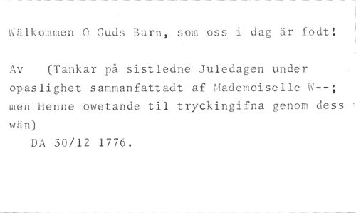 Välkommen 0 Guds Barn, som oss i dag är födt! //// Av (Tankar på sistledne Juledagen under //// opaslighet sammanfattadt af Mademoiselle W--; men Henne owetande til tryckingifna genom dess wän) //// DA 30/12 1776.