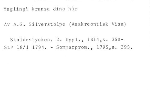 Yngling! kransa dina hår //// Av A.G. Silverstolpe (Anakreontisk Visa) //// Skaldestycken. 2. Uppl., 1814,s. 350- StP 18/1 1794. - Sommarprom., 1795,s. 395.