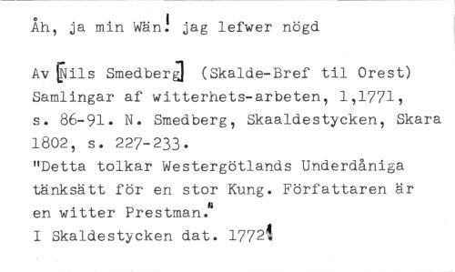 Åh, ja min Wän! jag lefwer nögd //// Av INils SmedberJ (Skalde-Bref til Orest) Samlingar af witterhets-arbeten, 1,1771, s. 86-91. N. Smedberg, Skaaldestycken, Skara 1802, s. 227-233. //// "Detta tolkar Westergötlands Underdåniga tänksätt för en stor Kung. Författaren är en witter Prestman." //// I Skaldestycken dat. 17721