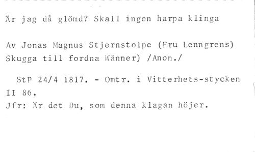 Är jag då glömd? Skall ingen harpa klinga //// Av Jonas Magnus Stjernstolpe (Fru Lenngrens) Skugga till fordna Wänner) /Anon. //// /StP 24/4 1817. - Omtr. i Vitterhets-stycken II 86. //// Jfr: Är det Du, som denna klagan höjer.